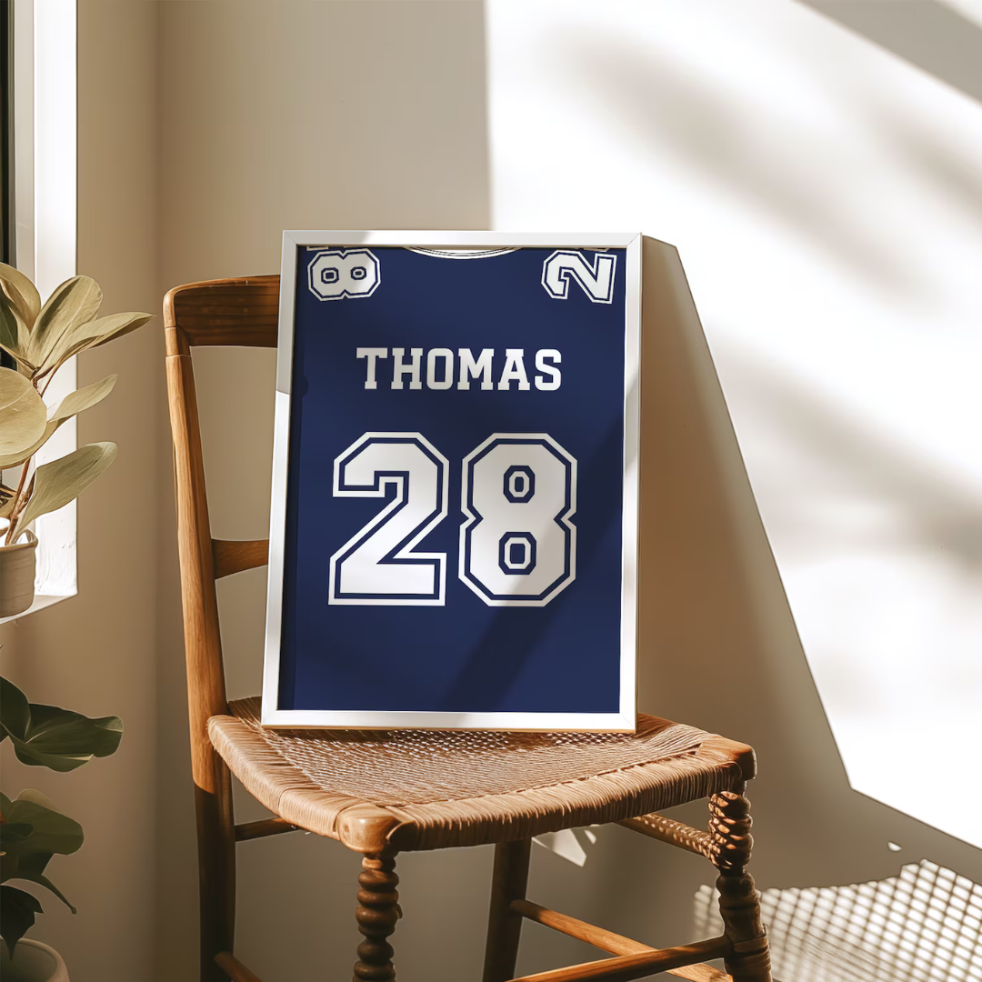 Score a goal with this customised Personalised Jersey Poster! Show off your love for your favourite team and player with a unique and quirky twist. Hang it up in your room or office for a playful and fun addition to any decor. Perfect for sports enthusiasts and fans.